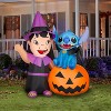 Celebrate Halloween with an Airblown Inflatable featuring Lio and Stitch. Lilo wears a witch costume while Stitch wears a bat collar and sits on a jack-o'-lantern. Together, they make a spooktacular addition to your Halloween decorations. Setup is super simple. Just plug it in, stake it down and watch the magic unfold. Be the talk of the block with an eye-catching inflatable!