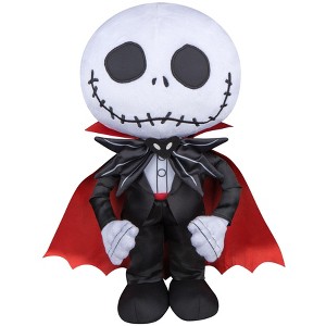 Make Halloween magical with our nifty Jack Skellington greeter. This adorable Jack Skellington character makes a spooktacular Halloween gift or party accent. Wearing a black suit and red vampire cape, Jack is dressed to impress. Delight Nightmare Before Christmas fans of all ages with our huggable Jack Skellington Halloween greeter! For indoor use only.