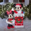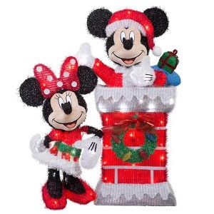 This lighted Mickey Mouse and Minnie Mouse 3D sculpture makes a delightful addition to your indoor or outdoor Christmas decorations. Features Mickey Mouse in a Santa suit inside a chimney and Minnie Mouse in red holiday attire. This whimsical holiday yard decoration is made with soft, fuzzy material that creates a tinsel effect. Beautiful on its own or combined with other items from the collection. Bring the Magic Home with the Disney Magic Holiday collection. Mickey Mouse and Minnie Mouse 3D tinsel yard sculpture. Lights up with 90 LED lights. weather-resistant. For indoor and outdoor use. Measures 29.53"H X 11.81"L X 16.73"W.