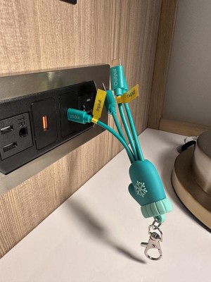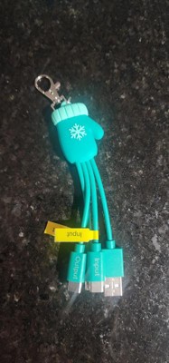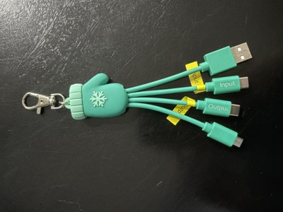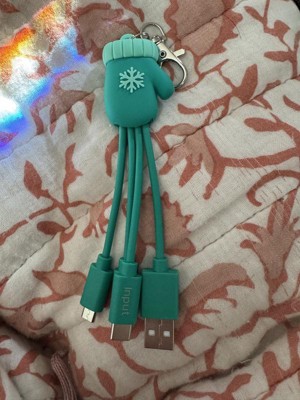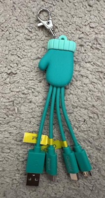 Handy charger for on the go folks. Has several connection ports for more convenient use with several devices. The design is kind of cool as it looks like a mitten. And it can be easily store as it has a Keychain compatible clasp.