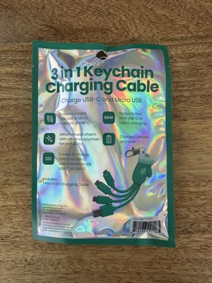 Cute little keychain with USB-C and Micro USB charging cables. Comes in handy for travel or to keep in the car, which is where I am using it as an extra for the backseat USB-A outlet. Since it has a keychain clip I attached it to the net behind the carseat. Small enough to fit in a purse as well. Three different charging options for one device at a time: USB-A to USB-C; USB-A to Micro or USB-C to USB-C