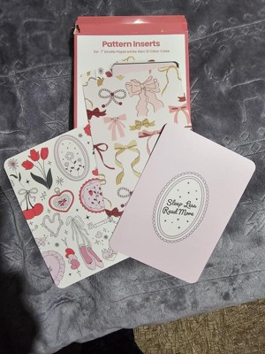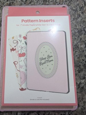 Add some livelihood to your reading experience with these Gems Kindle Inserts. These inserts fit seamlessly into your 7" Kindle Paperwhite Gen 12 case. This pack comes with 3 unique designs: 1 floral heart pattern, 1 bow pattern, and 1 "Sleep Less Read More" insert. The interchangeable design allows you to switch up your Kindle's look whenever you want.