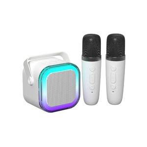 The GEMS Portable Karaoke Speaker with Microphones lets you turn any moment into a sing-along party. This all-in-one wireless speaker comes with two microphones and vibrant RGB LED lights that set the mood for your favorite tunes. With wireless, AUX, and USB connection modes it’s easy to play tracks from almost any device. The built-in carrying handle makes it simple to take your karaoke setup anywhere, and the rechargeable battery keeps the fun going for up to two hours. With handy controls right on the speaker and microphones, the GEMS Portable Karaoke and Mics is ready to get everyone singing.