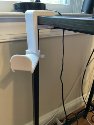 Adjustable headphone hanger to attach to your desk. The attachment is pressure mount (no tools needed) and can fit many different desk thicknesses. The part it hangs on can swing to several different angles. It is wide enough to support many different headphone sizes. Great option to keep those headphones out of the way.