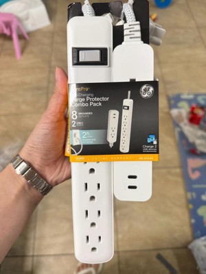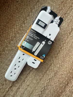 Power, charge and protect more with the GE USB-Charging Surge Protector Combo Pack. Two surge protector power strips feature a total of eight grounded outlets and two USB-C charging ports (12W/2.4A shared) to power and charge your electronics, household appliances, lamps, seasonal décor, smartphones, tablets and more. Each surge protector has a flexible 2ft. braided cord that resists tangling and extends the reach of wall outlets to get power where you need it. Additionally, each cord’s low-profile flat plug fits easily behind furniture and keeps the cord close to the wall. For peace of mind, each surge protector is thoroughly tested, ETL safety certified, rated for 245 Joules and backed by a $25,000 connected equipment policy and limited-lifetime replacement plan. Additionally, the 6-outlet surge protector includes an integrated circuit breaker with reset switch for added protection against circuit overloads. Create essential power stations through your home or office with the GE USB-Charging Surge Protector Combo Pack.