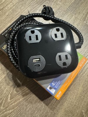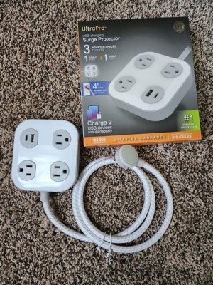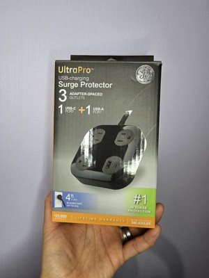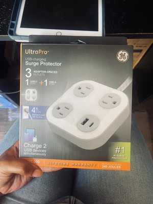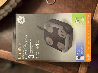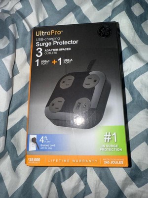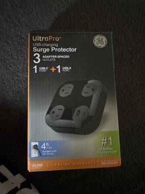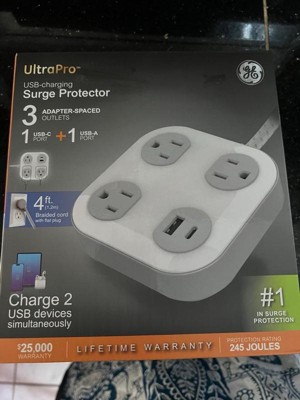 Power your devices in style with the GE 3-Outlet Surge Protector with USB Charging. With three adapter-spaced three-prong outlets, one USB-A port and one USB-C port (12W/2.4A shared), this versatile surge protector creates a central powering station for all your electronics, household appliances, smartphones, tablets and more. The 4ft. extension cord features a braided fabric cover that resists tangles, and its space-saving flat plug fits perfectly behind furniture and in other tight spaces, keeping the cord close to the wall. The sleek black finish and adapter-spaced outlets combine style and convenience, letting you use several bulky plugs while keeping the other outlets unobstructed and ready for use. Additionally, the rubberized feet ensure the surge protector stays in place. Built to protect your electronics with the highest of industry standards, this surge protector power strip provides 245 Joules of protection to guard against voltage spikes. And, for extra peace of mind, this product is backed by a $25,000 connected equipment policy and a limited-lifetime replacement plan. Thoroughly tested, ETL safety certified and created to last, the GE 3-Outlet Surge Protector with USB Charging provides the best in streamlined power.