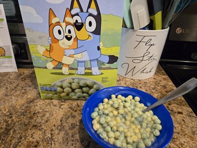 - CONTAINS: One cardboard box of crunchy Bluey Cereal, Crispy Corn Cereal Puffs, Made with Whole Grain, Family Size, 18 oz; Perfect for instant snacking, or a part of breakfast and meals