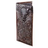 Rectangular leather wallet with embossed design at front featuring interior driver's license window and multiple card slots
