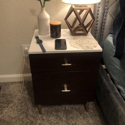 I love this nightstand. I spent months looking for a piece that was the perfect mix of dark wood, gold accents, and white. This is it! Great quality, particularly for the price. Shipped and arrived quickly, nothing was damaged. Assembly was easy. I put it together alone in under an hour. The whole process was quick and painless. I highly recommend this nightstand.