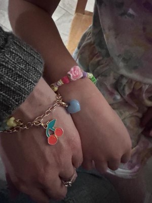 - Set Includes: 22 Interchangeable Charms (Enamel, Resin, and Plastic), 1 Gold Paperclip Chain with Lobster Clasp (16 in.), 1 Gold Bracelet Chain with Lobster Clasp (7.5 in.), 3 yds of Elastic Cording, 30 Round Faceted Beads, 30 Round Beads, 30 Bicone Beads, 75 Pearl Beads, 42 Round Alphabet Beads, 50 Disc Beads, 2 Smiley Face Beads, 5 Heart Beads, 4 Polymer Clay Beads (Strawberry, Avocado, Smiley Face, Flower, Blue Rainbow), 2 Bow Beads, 2 Rose Beads, 1 Pink Lobster Clasp Carabiner (1.5 in.), Project Guide