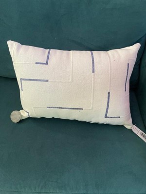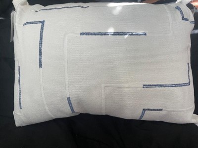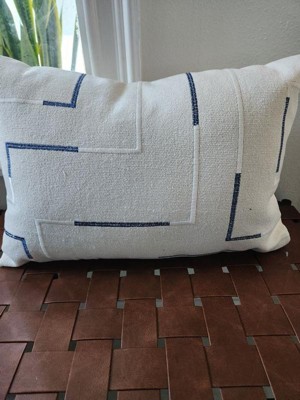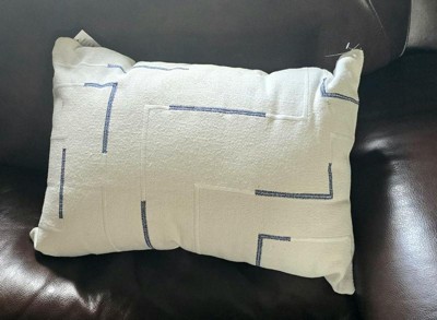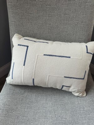 [This review was collected as part of a promotion.] This pillow goes perfect with our wall, color and chair design. The pillow itself is ivory and dark blue geometric lines with a cotton poly fill. The second I took this pillow out of the bag. I knew it was very plump. It is extremely filled to the brim and the pillow itself is very well-made with a nice soft fabric. I’ve only had it for two days so I’m not sure how it will hold up overtime, but at the moment I love everything about this pillow it’s a perfect accent.