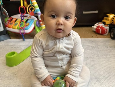 Since this is my second baby, I really haven’t bought her anything, she’s been wearing hand me downs. So I was very happy to receive this product through the Stellar Product Testing Panel. First off, I love the material! It’s so soft and not too thick. It’s winter but the heat in my apartment is always blasting. So this is a good balance. If it gets too cold then I just put a sweater over. I also LOVE the way the zipper is. It’s a one way but better than a two way, it starts from the top and ends at the bottom. My baby is also 7.5 months and fits into a 3-6 months. She’s about 17.5lbs and 26” tall.