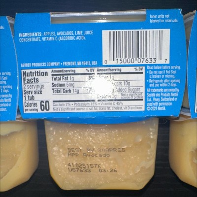 Gerber Stage 2 Baby Food, Apple Avocado Puree Tubs are a premium choice for your child’s early stages. Crafted to help support their nutritional needs, along with meeting the busy lifestyle needs of caretakers and parents. Each baby puree tub comes in a portable, easy-to-store format – making it perfect for life’s busy moments. This stage 2 baby food puree is designed for babies who are 6 months + and are ready to explore new textures and flavors. Gerber understands the importance of providing wholesome ingredients during the crucial developmental stages of your child's life -- that’s why our baby puree is Non-GMO Project Verified. Gerber baby puree is ideal for parents who seek a convenient and high-quality option in their baby's diet. These tubs need to be refrigerated after opening and must be used after 1 day.