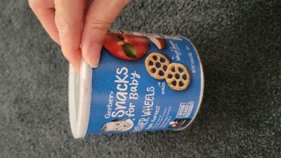 my son can fit a whole wheel in his mouth, so I have to break them appart in small pieces, I hate them, they are too sweet, Im not a big fan of giving my son gerber snacks but they can save me from some troubles...not this wheels tho, hate them, they could be a choking hazard.