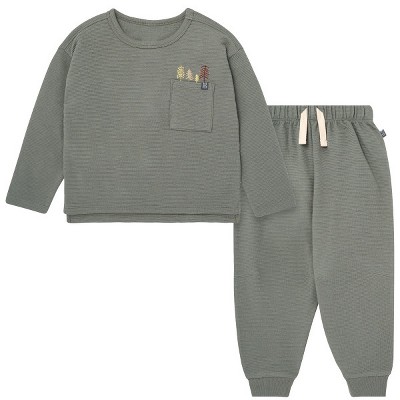 Made from soft and breathable cotton, this matching toddler boy outfit is perfect for cooler days. The Henley style long sleeve shirt keeps your little one warm and is easy to layer a jacket over if needed. The pants feature a stretchy waistband for a secure, comfortable fit all day. With cinched ankles, he’ll feel extra cozy even as the temperatures drop. Perfect for play dates or casual outings, this outfit is a versatile addition to your toddler's wardrobe. Our essentials have been independently certified with STANDARD 100 by OEKO-TEX® so that you don’t have to worry about harmful substances in your baby’s wardrobe. This pack includes one shirt with matching pants.
