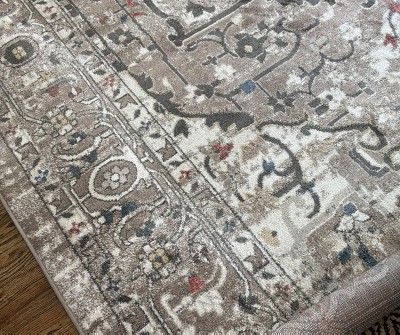 Very thin rug. Arrived well packaged and clean. Color is mostly taupe and dark gray with some ivory, blue, gold and coral. Very prominent pattern that overtakes the room.