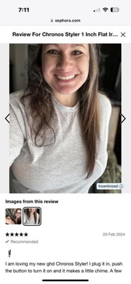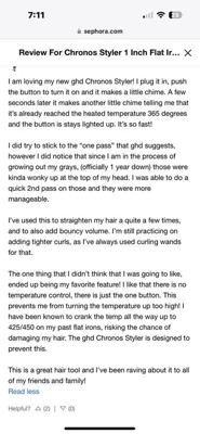 I no longer see this review on my account from a few months ago, so I’m reposting. I am loving my new ghd Chronos Styler! I plug it in, push the button to turn it on and it makes a little chime. A few seconds later it makes another little chime telling me that it's already reached the heated temperature 365 degrees and the button is stays lighted up. It's so fast! I did try to stick to the "one pass" that ghd suggests, however I did notice that since I am in the process of growing out my grays, (officially 1 year down) those were kinda wonky up at the top of my head. I was able to do a quick 2nd pass on those and they were more manageable. I've used this to straighten my hair a quite a few times, and to also add bouncy volume. I'm still practicing on adding tighter curls, as l've always used curling wands for that. The one thing that I didn't think that I was going to like, ended up being my favorite feature! I like that there is no temperature control, there is just the one button. This prevents me from turning the temperature up too high! I have been known to crank the temp all the way up to 425/450 on my past flat irons, risking the chance of damaging my hair. The ghd Chronos Styler is designed to prevent this. This is a great hair tool and l've been raving about it to all of my friends and family!