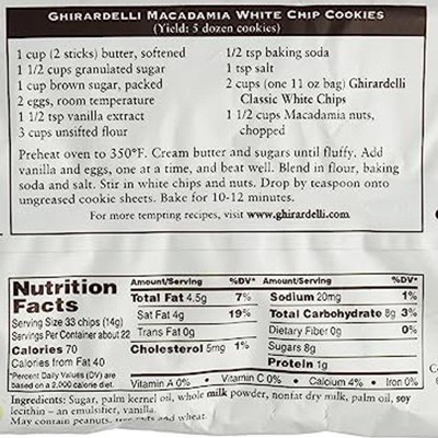These chips are NOT real white chocolate! Beware. True white chocolate is still chocolate bc the dairy has cocoa butter. These chips used to be genuine white chocolate, they are NOT anymore. The taste is sour and phlegmy. Buy the white chocolate bar by Ghirardelli,— most cases, just look up on the same aisle— really delicious. These chips are just oils, dairy, and lecithin— just oily sweetened dairy chips Sad.