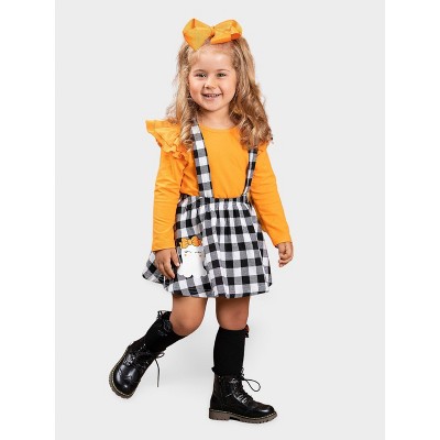 This darling plaid overall skirt set is simply drop-dead gorgeous for your little ghoul! Brightly colored with charming graphics that capture the SPIRIT of the season!