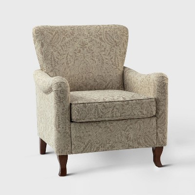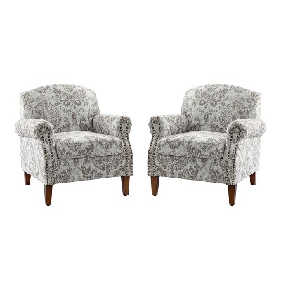 This armchair can add an eye-catching touch to your bedroom or living room. This armchair features a damask pattern and rolled arms which create an exquisite look. The nailhead trims on the arms show an elegant accent of design. Wrapped in 100% polyester, the built-in S-spring and thick foam provide you maximum comfort. This armchair is made of solid and manufactured wood and the four sturdy legs support the entire frame, so you don't worry about its weight capacity. This armchair can bring a chic style to your bedroom or living space. Item Size:31"Wx31"Dx33"H Seat Size:18.5"Wx21.5"Dx20"H