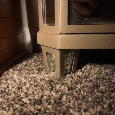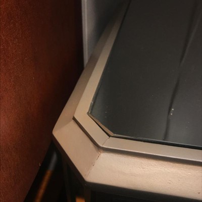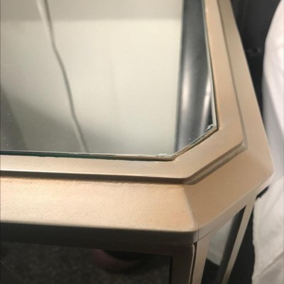 What we received is not what is pictured! 2.5” shorter than advertised, see picture of stubby feet. Looks more silver than gold. Paint is sloppy and on mirror. Mirrors scratched. Drawer construction is cheap and difficult to open/close. Not worth the price, does not look like the picture. Don’t buy!!