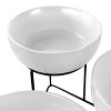 The Gibson Elite 4 piece bowl set is perfect for serving chips and dips or side dishes. This set is designed with sophisticated style that brings character and richness to the table, blending seamlessly with a wide array of colors and motifs. Includes three bowls, varied in size to hold different food items, and one metal rack that holds the bowls on tiered levels for easy serving. Dishwasher and microwave safe stoneware bowls for easy clean up and reheat!