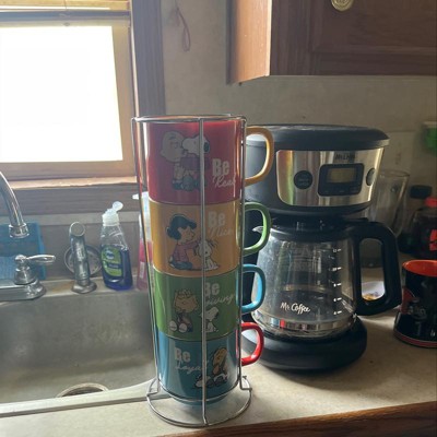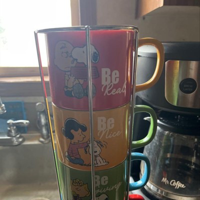 Gibson Peanuts Classic Gentle Reminders Collection 4 Piece Stoneware Stackable Mug Set with Metal Stand in Assorted Colors