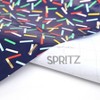 A: The wrapping paper features a multi-colored confetti pattern with gold foil on navy.