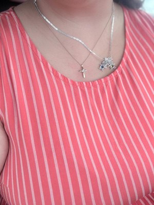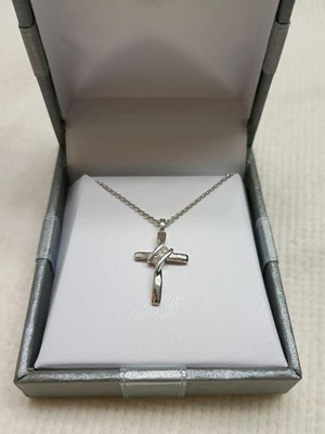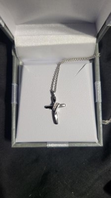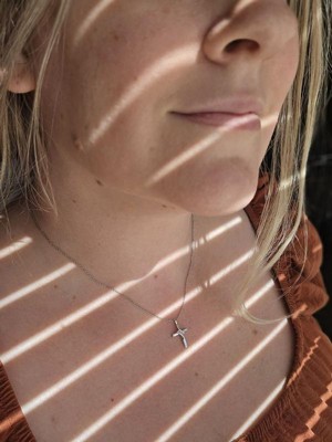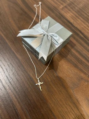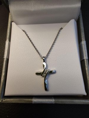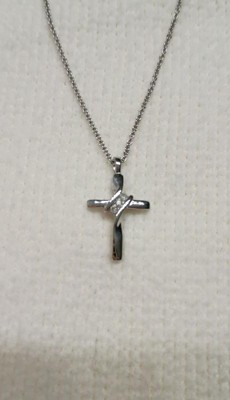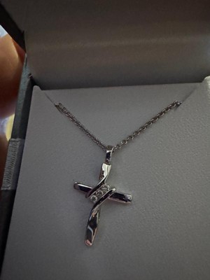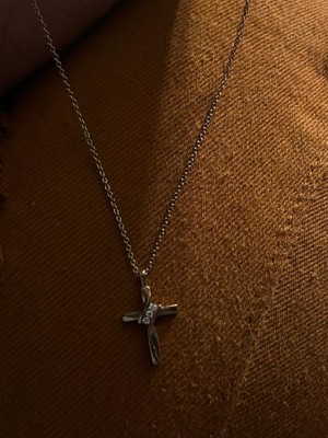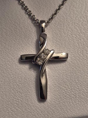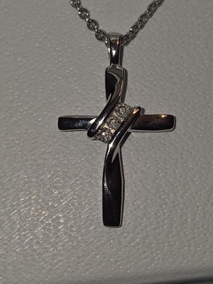 [This review was collected as part of a promotion.] Dainty and beautiful... sterling cross necklace This is a pretty sterling silver cross pendant with three small diamonds placed diagonally at the crossbar. It's a small pendant but is very classy looking. It comes on an 18 inch sterling chain which makes the cross pendant lie nicely on the collarbone.