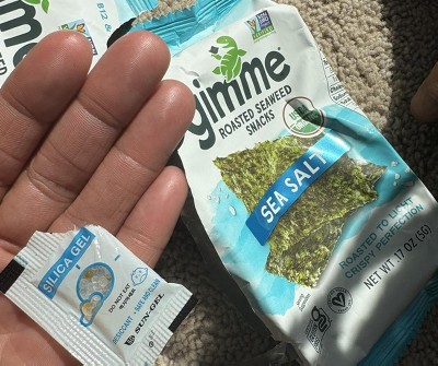 I’m not even sure where to start here..we purchased these sea salt seaweed snacks, as a healthy snack for our kids. I gave one pack each to my 2 kids and my daughter comes up to me, asking me to open the “salt packet” that comes with the seaweed, because after all, the package does say “sea salt seaweed snacks”, so of course she thinks maybe I need to sprinkle this “salt” on before I open it. Low and behold, it was not a salt packet, it was in fact a desiccant packet. Yes - the SILICA GEL pack that keeps things dry. I understand why it’s in the pack, but Thank God I did not send these to school in my kids lunch or something, outside of my supervision, because they definitely would’ve landed us a trip to the hospital. There is no indication other than the teeny tiny print on the desiccant package itself, saying ‘do not eat’. These are a lawsuit waiting to happen!