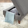 Enhance your living room with this Ginger storage chaise. This fashionable chaise doubles as storage, allowing you to hide extra pillows, blankets and more. The entire seat flips open, revealing ample storage space inside. Upholstered in a Stone, Gray or Blue textured fabric with tapered wood legs. Removable back cushion.