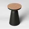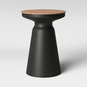 - Black metal drum accent table with flat wooden tabletop adds functional decor to any seating space