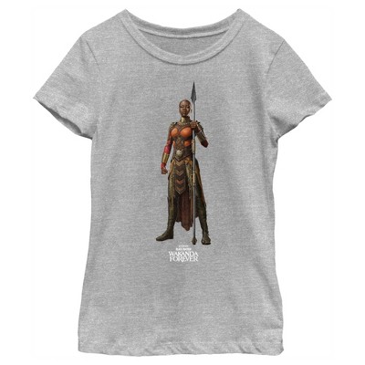 Join the Wakandans in the wake of King T'Challa's death as they band together to fight to protect their kingdom from outside world powers in the powerful sequel to Black Panther, Black Panther: Wakanda Forever, with exciting new officially licensed apparel for the whole family from Marvel! This new Girls' Black Panther: Wakanda Forever Namora Portrait Graphic T-Shirt features a portrait of Namora wearing her iconic feathered headdress and her name written below. Fight for Wakanda in style with these cool new designs!