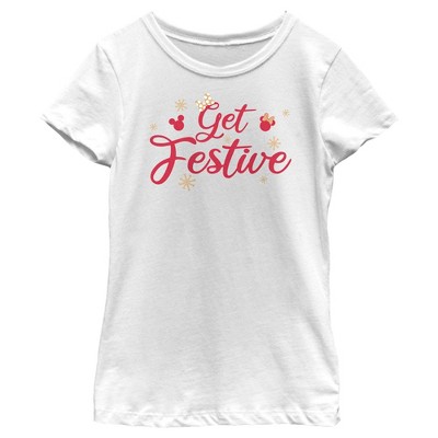 Who knew that dressing "mousey" could be so cute!? Celebrate Walt Disney's most iconic character with this officially licensed Mickey Mouse and Friends style! This adorable Get Festive Girls' Tee features a graphic of "Get Festive!" across the front surrounded by flowers and mouse silhouettes. Perfect for any holiday celebration!