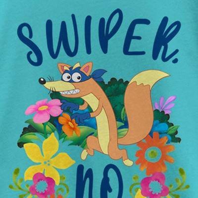 Swiper, no swiping these officially licensed Nickelodeon Dora the Explorer Girls' Graphic Tee! This colorful shirt reads the iconic quote from the show: "Swiper, No Swiping!" in navy script font and Swiper the fox surrounded by colorful pretty flowers across the center. Go on an adventure with Dora, her talking purple backpack, and a monkey named Boots with a fun Nickelodeon tee that brings this educational animated television series to life.