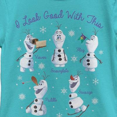 • Strut your stuff with this stylish new everyday Girls' T-Shirt that is perfect for every occasion! Featuring your Olaf with the phrase "I look good with this" printed in purple, trying different nose replacements!