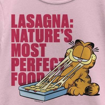 • Strut your stuff with this stylish new everyday Girls' T-Shirt that is perfect for every occasion! Featuring Garfield sitting down eating lasagna alongside the quote: "Lasagna: Nature's Most Perfect Food" printed in red letters.