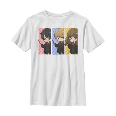 Unlock magical secrets hiding in the closet under the stairs with all your favorite witches and wizards, learn spells, study wizardry, defeat He Who Shall Not Be Named, and uncover the mysteries surrounding the magical school for wizards! This officially licensed Harry Potter Gryffindor Cartoon Characters Girls' Graphic T-Shirt features Harry Potter, Ron Weasley, Hermione Granger, Minerva McGonagall, Fred Weasley, and George Weasley in a cute anime cartoon style with the word "Gryffindor," below. And, just remember, the spell is Wing-gar-dium Levi-o-sa and NOT Wingardium Leviosa!