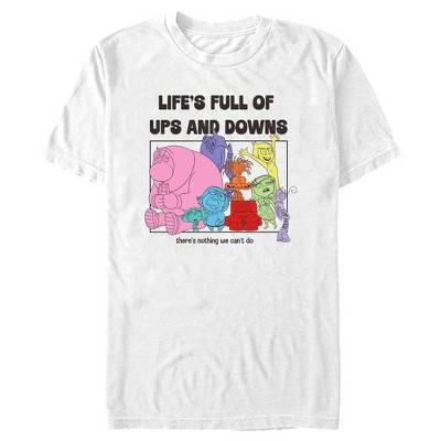 Get ready to find out what happens when Anxiety takes over in the highly anticipated sequel to Disney Pixar's Inside Out, Inside Out 2! Watch along in style with colorful new officially licensed apparel for the whole family, as Riley becomes a teenager and Headquarters gets shaken up! This Girls' Inside Out 2 Life's Full of Ups and Downs Graphic T-Shirt features all the emotions including Joy, Sadness, Anger, Fear, Disgust, Anxiety, Ennui, Embarrassment, and Envy in their respective colors with the phrase: "Life's Full of Ups and Downs There's Nothing We Can't Do" printed across the front. The only emotion you'll be feeling is happiness with these all-new styles from Inside Out 2!