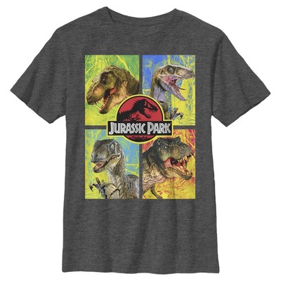 The Jurassic Park T. Rex and Velociraptor T-Shirt spends its time hanging out with the top of the dinosaur food chain. The Jurassic Park logo is printed next to four squares featuring T. rex and velociraptors printed on the front of this awesome Jurassic Park shirt.
