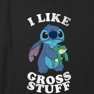 Ohana means family, and family means getting your loved ones the best look with these new graphic tees from the animated film Lilo & Stitch from Disney! This Lilo & Stitch I Like Gross Stuff Stitch Distressed Girls' Cropped T-Shirt features a cool distressed graphic of Stitch holding a frog along with the phrase: "I Like Gross Stuff." Celebrate a certain alien, otherwise known as Experiment 626 in style with a new adorable tee from the movie!