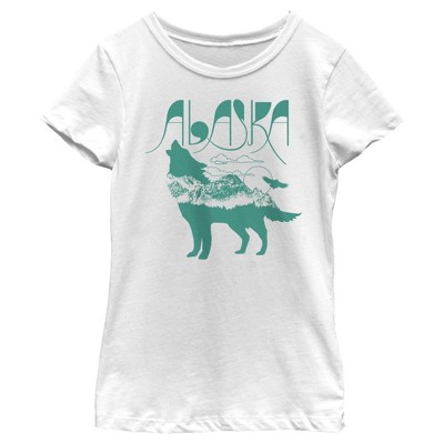 • Strut your stuff with this stylish new girls' cropped t-shirt that is perfect for every occasion! Featuring a mountain rage scene and a howling wolf silhouette, along with "Alaska" printed in matching teal green lettering across the front.