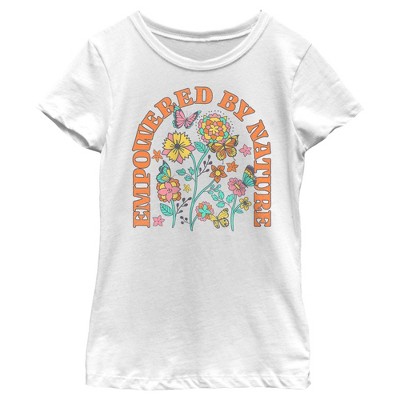 • Strut your stuff with this stylish new girls' t-shirt that is perfect for every occasion! Featuring a distressed design with the text: "Nature blooms," with mushrooms, butterflies, and flowers across the front.