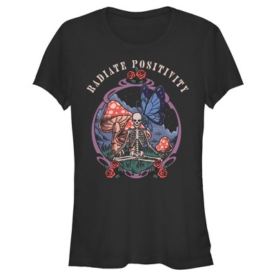 • Strut your stuff with this stylish new girls' t-shirt that is perfect for every occasion! Featuring a skeleton meditating with mushrooms, a butterfly, flowers, and the text: "Radiate Positivity," across the front.