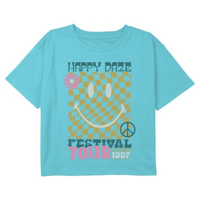 • Strut your stuff with this stylish new girls' crop t-shirt that is perfect for every occasion! Featuring a 70s-inspired butterfly with flowers, mushrooms, and clouds in the background.