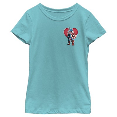 Lose yourself in the pages of a comic book or the movie adventure of a lifetime with your favorite Marvel superheroes! Get in the Valentine's Day mood with this officially licensed Girls' Marvel Captain America Small Heart Portrait Cropped T-Shirt, featuring a small Captain America with a heart behind him on the upper left chest. Grab some new Marvel apparel for the whole family today and show some love for your favorite superheroes!