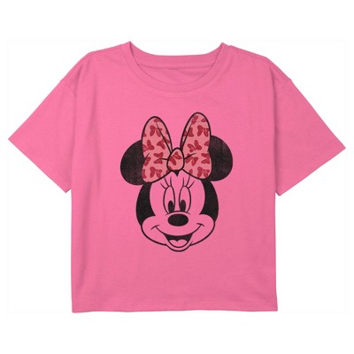 • Strut your stuff with this stylish new girls' cropped t-shirt that is perfect for every occasion! Featuring a distressed graphic of a large Minnie smiling and sitting in a cute pose across the front.