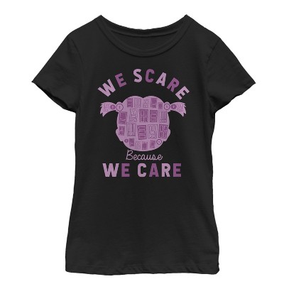 Mary, or Boo, is so cute even monsters can't help but love her! Join in the fun with the Monsters Inc. Boo We Care Girls' T-Shirt! The lovable Boo is portrayed with "We Scare Because We Care" in purple text down the front of this Monsters Inc. tee.