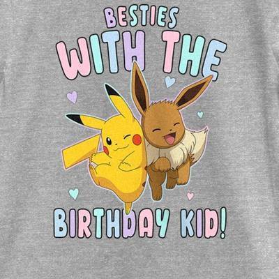 • Strut your stuff with this stylish new girls' t-shirt that is perfect for birthdays! Featuring Pikachu and Eevee with the phrase: "Besties with the Birthday Kid!" in pastel colored lettering across the front.