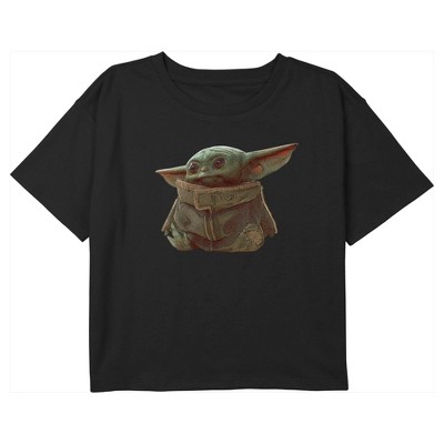 • Strut your stuff with this stylish new girls' cropped t-shirt that is perfect for every occasion! Featuring Grogu, the cute green baby alien with the Star Wars logo above him.